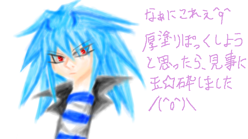 昨日の1人絵チャで、なにを思ってか厚塗りに挑戦してみましたが見事に粉砕☆玉砕☆大喝采しました\(^o^)/なぁにこれぇ?厚塗りっていうかむしろ水彩ぽっいような気がするぞ;私にはこれで精一杯だorz文庫本のあの表紙達はホント神だよな・・・さすが和希だっ!!リアルに描くのがいかに難しいか昨日改めて思いました^^;リアルで厚塗りが出来る人ってホント凄いよなぁ・・・勉強不足だなorz