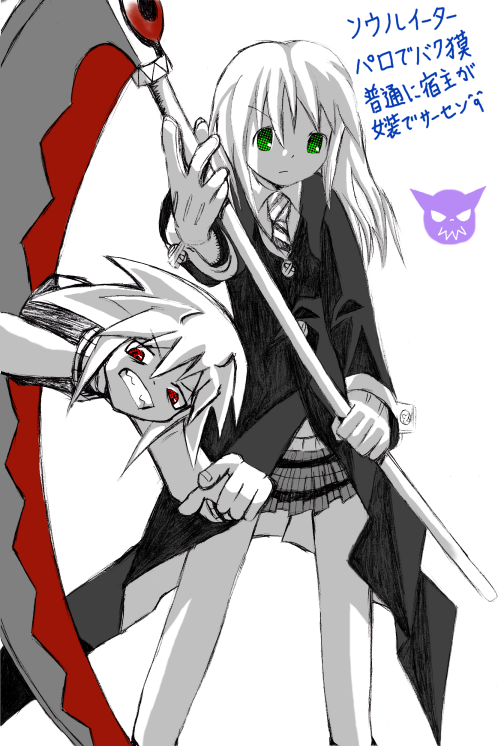 ラクガキが普通に女装です^^;そしてスカートの丈が異様に短いです;いや、元ネタが最初からこうなんです/(^o^)\ただ宿主の生足が描きたかっただけです^^;最初、宿主の髪の毛を結ぼうか悩んだのですが、結ぶと普通にマカちゃんになってしまったので結ばないでほどきました;これでいくらかは宿主に見える・・・かな?^^;それにしても、酷いラクガキだ\(^o^)/元ネタの原作を見てちゃんと模写したつもりが色々おかしくなってるorz腕の長さとか、鎌の持ってる部分とかorzだって、鎌は定規を使うのがめんどくさくてフリーハンドだもん!!(オイ)しかもコピー用紙に描いたラクガキだからいいやと思って/(^o^)\それにしても、ソウルバクラが表情に違和感がないように見えるのは私だけですか^^;性格は全然違うけど;ソウルは自称クールって名乗ってますが;バクラってクールキャラじゃないなぁ・・・位置づけとしてはソウルでいいかも知れない^^でも、口調とかそれっぽいって思うのがブラック☆スターなんだよなぁ・・・自分でオレ様って言ってるし、笑い方がヒャッハァー!!とかヒャハハって笑うんだよね^^;しかも、暗殺業なのに目立ちたがり屋;暗殺者が目立ってどうするんだ;うーん・・・バクラは目立ちたがり屋ではないし・・・じゃあ、シュタインかなぁ・・・サディスティックな所は似てるけど、口調と性格がやっぱ合わないなぁ・・・シュタインは顔に傷がある繋がりで盗賊王でも良いかなぁ・・・なんて^^;宿主はもちろんヒロインポジのマカちゃんでOK!!あっ、なんかソ/ウ/ル/イー/ターで色々ばくらずパロを語ってしまった;ソ/ウ/ル/イー/ターがわからない人には何がなんだかわからなくてすみません^^;ホント、今のところばくらずでパロブームが到来してますね^^パロ大好きだからいいですけど\(^o^)/