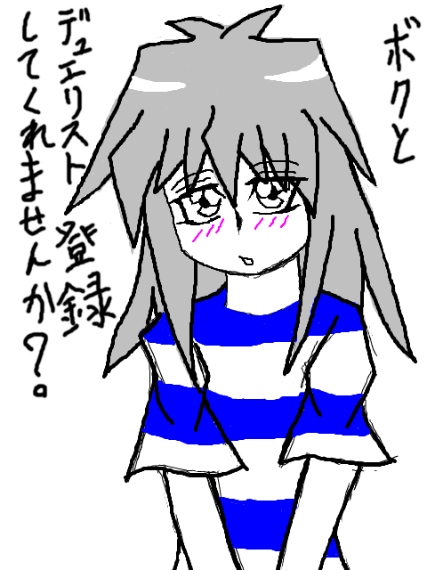 トラバ/ドールの話なんですが、な、なんと嬉しいことに初めてのデュエリスト登録がばくよしくんでした!!\(^0^)/上の絵は管理人ビジョンでこう見えました^q^ばくよしくんが初めてのデュエリスト登録なんて嬉しすぎる・・・!!他のキャラは別にどうでもいいけど(お)おかげでばくよしくんと親密度がちょっとUPしました!!もっともっと親密度あげるぞ!!というか、このゲームって恋愛ゲームじゃないの?(何)ホント恋愛フラグ立ってるようにしか思えない^^もう、ばくよしくんが「君って結構強いんだね。ボクとデュエリスト登録してくれませんか?」と言われた時は嬉しくて心臓バク獏だよ!!(え)それと夜中の深夜徘徊をしてると必ず迷宮兄弟が邪魔をしてくるんですが。今度は弟だけじゃなくて兄も邪魔してきて非常にウザイったらありません。お前らに用はねぇんだよ!!bkrに会いたいんだよ!!(オイ!)何回も夜中出歩いているのに出てこないのはやっぱydnsといちゃこらしてるんだ!!ydnsと夜中励んでるんだよ!!(何を!?)