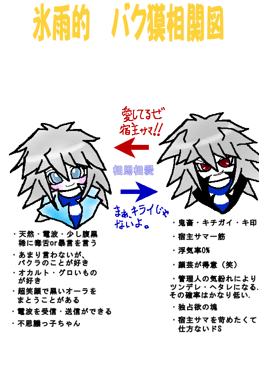 UPするものがなかったので、日記代わりに使っていたオエビの方から引っ張ってきました;確か、これって携帯サイズ用に作った待ち受け画面なバク獏です;また、暇があったら携帯の待ち受け画面作ろうかな・・・誰も使わないけどね!!(笑)