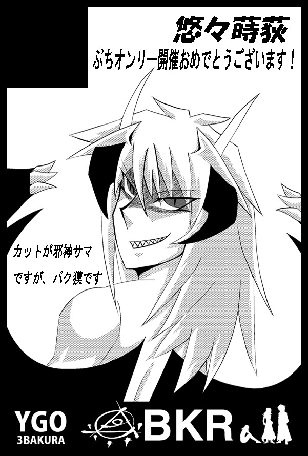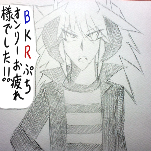 BKRぷちの主催者様に参加していた皆様方、本当にお疲れ様でした!また、スペースにて本を買って頂いた方々ありがとうございました!!イベントとその後のオフ会もとっても楽しかったです!!イベント中はついったのフォロワーさんと直接お会いできたりしたので嬉しかったです!只、緊張しててテンパってたりしてましたが;あっ、ついったのフォロワーさんでぞくおコスの方がいて、その方から生のにんにく頂きましたw盗賊王からのにんにくのプレゼントがあるとはwまさかのサプライズでした!!で、イベント終了後はばくら部のメンバー+新入さんでオフ会しました!いやーいつものごとく色々すごかった!(トリ○的な意味で←)あっ、ちなみにオフ会場所はカラオケ→満喫でしたよ!!あそこの満喫すごい広いし本当に家だよ!のびのびだるだるできたしね!遊戯王のDVD鑑賞もしたし!私は家の事とか色々あるし、仕事が次の日にあるってことで先に帰りましたが、あの満喫の居心地よすぎる!帰宅は昼ごろにアパートに着きましたよ!オフ会では素敵な絵も頂いたし色々語れてよかった!!で、上の絵は私が買い物に行ってる間のお留守番邪神さまをスケブに描いたのですが、スキャンするのがめんどくさくて写メでとったものです。言葉は変えてありますけどね。
