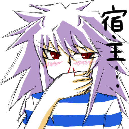 でも、気が付いたらこんな鼻血バクラになったよ!!← あれだ、宿主のあんな姿やこんな姿を妄想して鼻血がでたんだよ!!むっつり邪神だからしょうがないよね!!ってか、珍しくバクラの頬を染めてみたけどやっぱあわないwwww後、目に光も入れてみたけどなんか違う気がするwwwwバクラは邪悪面が一番だよ!でも描いてて楽しかったなんていうのはあったりする← むっつりなバクラも好きだよ!!但し、宿主のみに限るけどね!!