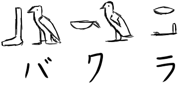 ついった-にも載せたけど、ここでも載せておきます。バクラの名前をヒエログリフで書くとこうなるようです。でも、日本語五十音で書いてあるやつを参考にしたので正しいかはわかりませんが><;名前に鳥が2匹って可愛いですね!参考サイト様→ttp://www004.upp.so-net.ne.jp/anubis/(頭のhは抜かしてあります)