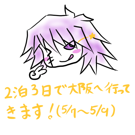 明日から2泊3日で大阪に旅立ちます!^^大阪なんて滅多に行けれないので旅行も兼ねて2泊3日ですよ!9日には帰ってきます!リアルタイム的な報告はついったーでします。後、昨日は身内でちょっと不幸ごとがあったので実家へ行ってました;大阪のハンドメイドアンソロ終わってないorzなので徹夜してそのまま大阪へ行きます^^;終わらなかったら諦めますorz