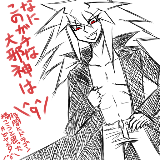 すいません・・・ちょっとした遊び心です^^;うん、今更になって脳内が沸いただけです・・・ホントは股間にゾークのドラゴンでも描いてやろうかと思ったけどやめた\(^o^)/そこまで描く気力が起きなかっただけですが← ぶっちゃけ、ドラゴンよりバクラの裸を描きたかっただけなんだ!!(オイ)裸黒コートはロマンだよ!(え)